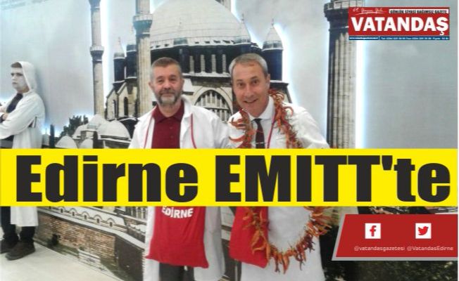 Edirne'yi tanıtmak için EMİTT'teki yerlerini aldıklarını ifade eden Edirne Tanıtma ve Tava Ciğeri Koruma Derneği Başkanı Bahri Dinar ile Başkan Yardımcısı Arif Meriç, “ Edirne Tav Ciğeri'nin ayrılmaz eşi olan Karaağaç acı Betxlarge biberini, badem ezmesi, deva-i misk ve cihannüma tatlılarını burada katılımcılara tanıtıyoruz” dediler.
