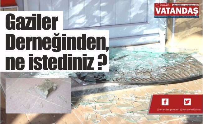 Önceki akşam kimliği henüz belirlenemeyen kişi ya da kişiler tarafından Edirne Muharip Gaziler Derneği'nin camı kırıldı. Saldırının ardından sabah derneğe gelen üyeler derneğe ait olmayan bir halı ve içerisine sarılı bıçak buldular. Halı ve bıçağın neden bırakıldığı konusunda emniyet güçleri araştırmasını sürdürüyor.