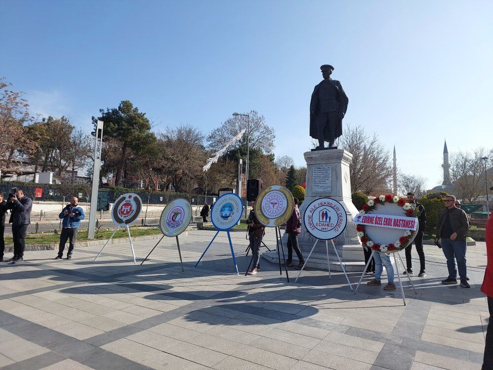 Edirne’de 14 Mart Tıp Bayramı dolayısıyla Saraçlar Caddesi girişinde bulunan Atatürk Anıtı’nda tören düzenlendi. Sağlık çalışanlarının katıldığı etkinlik, çelenk sunumuyla başladı. Saygı duruşu ve İstiklal Marşı’nın okunmasının ardından Edirne Tabip Odası Başkanı Prof. Dr. Celal Karlıkaya, 14 Mart’ın tarihine dikkat çekerek, bu günün sıradan bir bayram olmadığını vurguladı.