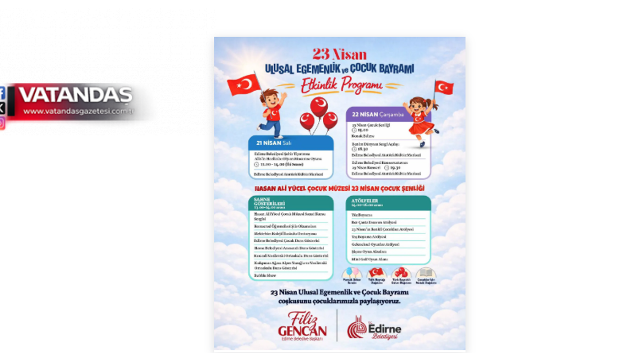 Edirne Belediye Başkanı Filiz Gencan, 23 Nisan’ın çocuklar için taşıdığı anlamın altını çizerek tüm çocukları ve ailelerini etkinliklere davet etti: “23 Nisan, çocuklarımızın neşesiyle anlam kazanan çok özel bir gün. Tüm çocuklarımızı ve ailelerimizi bu coşkuyu birlikte yaşamaya davet ediyorum.”