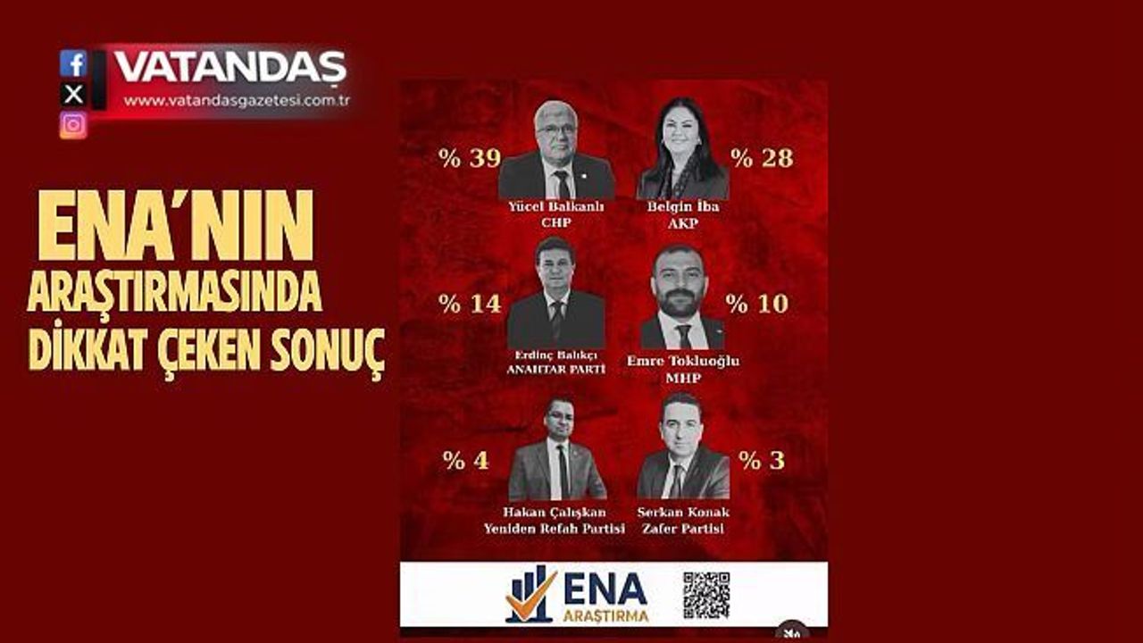 Anket sonuçları şu şekilde sıralandı: CHP – Yücel Balkanlı: yüzde 39 AK Parti – Belgin İba: yüzde 28, Anahtar Parti – Erdinç Balıkçı: yüzde 14, MHP – Emre Tokluoğlu: yüzde 10 Yeniden Refah Partisi – Hakan Çalışkan: yüzde 4 ve Zafer Partisi – Serkan Konak: yüzde 3.