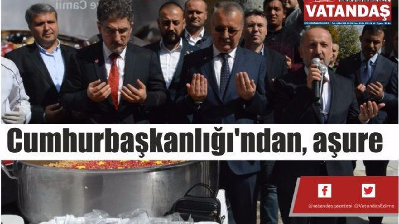 Cumhurbaşkanı Recep Tayyip Erdoğan'ın talimatıyla Muharrem Ayı dolayısıyla 13 ilde halka aşure dağıtıldı. Cumhurbaşkanlığı tarafından yapılan aşure dağıtımı kapsamında Edirne Selimiye Camii'nde 5 bin adet aşure Cumhurbaşkanlığı Ekonomi İzleme ve Koordinasyon Başkanı Hakan Yurdakul ile Edirne Valisi Günay Özdemir tarafından halka ikram edildi.