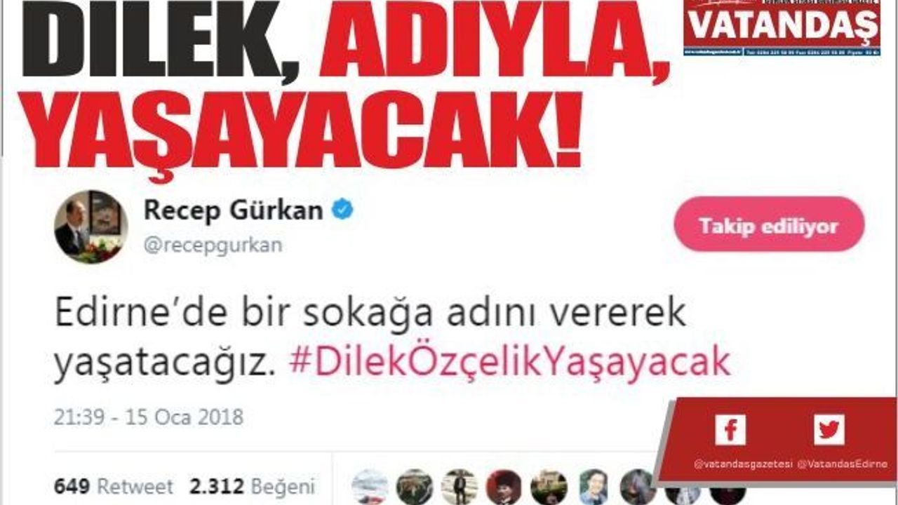 Sosyal Medyada da oldukça paylaşım alan bu konuda Edirne Belediye Başkanı Recep Gürkan'da duyarlı bir davranış sergileyerek, kişisel sosyal medya hesabından, 'Edirne'de bir sokağa adını vererek yaşatacağız. #DilekÖzçelikYaşayacak' şeklinde bir paylaşım yaptı. Kısa sürede yaklaşık 2 bin 500 beğeni alan paylaşıma çok sayıda tebrik cevabı da verildi.