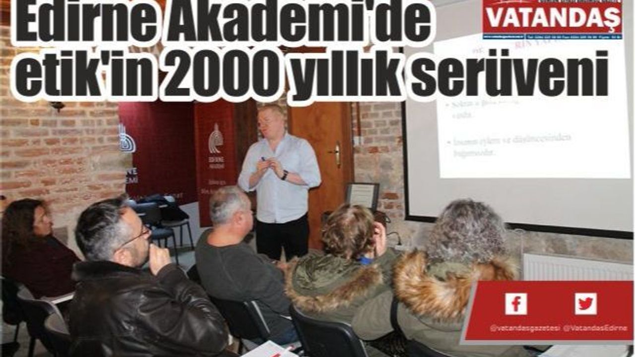 Edirne Akademi Hocası İletişim Sosyoloğu Taşçı, Eski Vali Konağı'nda bulunan Edirne Akademi'de akademi öğrencileriyle 'ETİK' dersinde bir araya geldi ve 2000 yıllık serüveni özetledi.