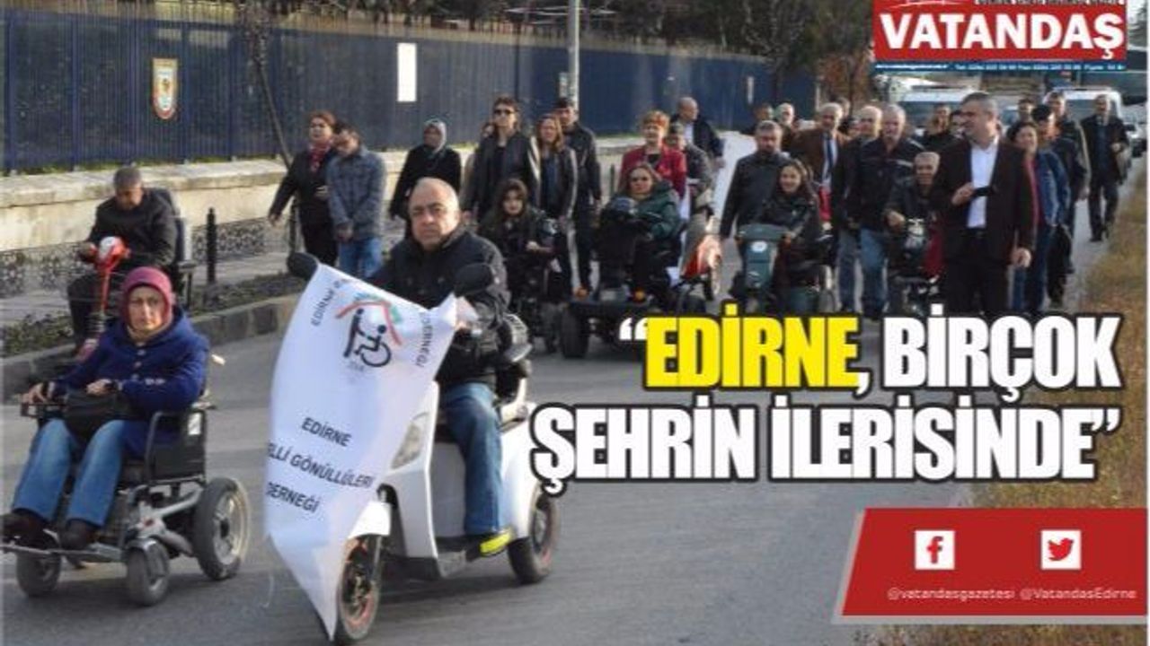 Edirne Belediyesi ve Edirne'de bulunan Engelli Dernekleri tarafından 3 Aralık Dünya Engelliler Günü nedeniyle gerçekleştirilen etkinlik, Edirne Belediyesi önünden Atatürk Anıtı'na kadar kortej yürüyüşüyle başladı. Ardından Edirne Engelli Gönüllüleri Derneği, Edirne Bedensel Engellileri ve Ailelerini Koruma Yardımlaşma Derneği, Trakya Roman ve Engelliler Yardımlaşma ve Dayanışma Derneği ile Edirne Gençlik ve Engellileri Destekleme Derneği tarafından Atatürk Anıtı'na çelenk sunumu gerçekleştirildi.