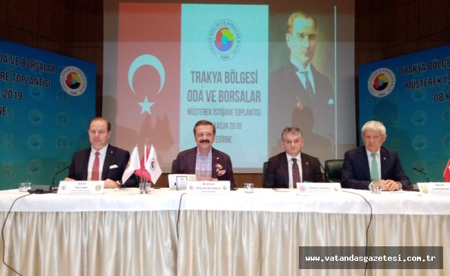 Edirne Ticaret Borsası’nda düzenlenen Trakya Bölgesi Oda ve Borsaları Müşterek İstişare Toplantısı’nda konuşan Türkiye Odalar ve Borsalar Birliği Başkanı Rifat Hisarcıklıoğlu, “Trakya bereketli topraklarıyla tarımın ve hayvancılığın merkezi. Tekirdağ sanayisiyle, Edirne tarihi ve kültürüyle, Kırklareli doğal güzellikleriyle çok önemli değerlere sahip. Bu coğrafyada limanımız, havayolumuz, demiryolumuz, otoyolumuz var. Yani bir işi yapmak için Allah bize her şeyi vermiş.” dedi.