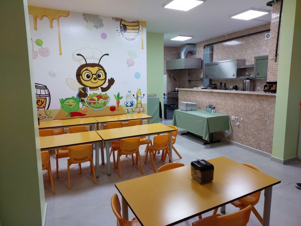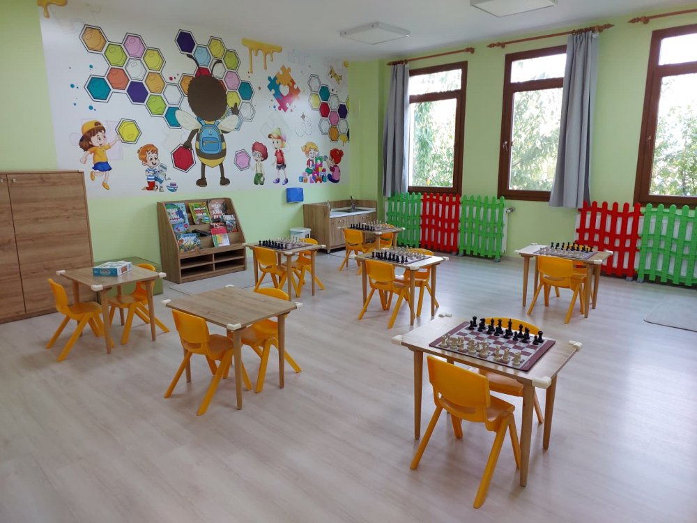 Okulun mutfak ve yemek alanı da konseptin bir parçası olarak arı temasıyla tasarlandı. Duvarlarda yer alan sevimli arı karakterleri, çocuklara sağlıklı beslenmeyi eğlenceli bir şekilde anlatıyor. Renkli mobilyalar ve ferah alanlar, çocukların hem öğrenme hem de sosyalleşme süreçlerini destekliyor.