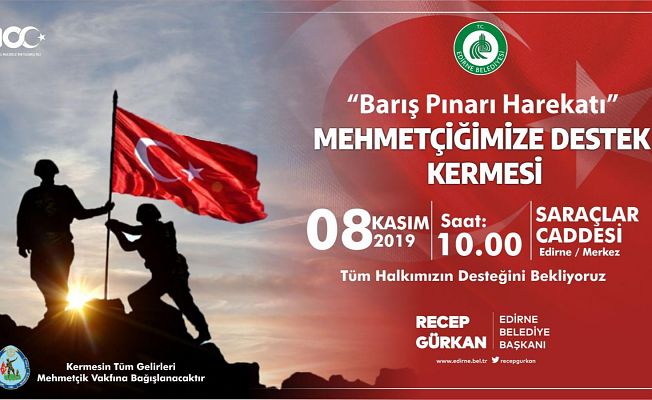 8 Kasım Cuma Günü Saraçlar Caddesi’nde Saat:10.00’da başlayacak olan kermese tüm Edirne Halkı’nı davet eden Edirne Belediye Başkanı Recep Gürkan, “Barış Pınarı Harekatı’nda görev yapan Mehmetçiğe destek vermek için geliri Mehmetçik Vakfı’na aktarılacak olan büyük bir kermes yapacağız. Kermesimiz, katkı sunmak isteyen herkese açık. Tüm vatandaşlarımızı, sendikaları, dernekleri, sivil toplum örgütlerini kısacası herkesi 8 Kasım Cuma Günü düzenleyeceğimiz kermese davet ediyorum” dedi.