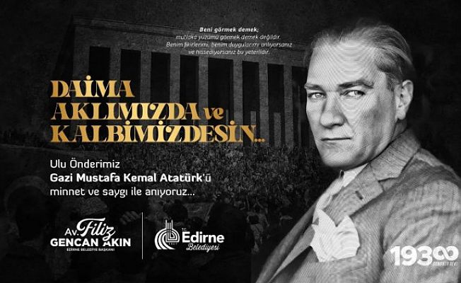 Edirne Belediye Başkanı Av. Filiz Gencan Akın, Türkiye Cumhuriyeti’nin kurucusu, Başkomutan Gazi Mustafa Kemal Atatürk’ü vefatının 86. Yılı nedeniyle bir mesaj yayınladı. Edirne olarak, O’nun eserini, ilkelerini ve vizyonunu daha da ileriye taşıma azmiyle çalışarak; aydınlık yarınlara doğru emin adımlarla yürümeye devam edeceklerini kaydeden Başkan Gancan Akın mesajında şunları ifade etti: