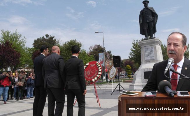 Burada bulunan tüm kurum ve kuruluşlar adına konuşmayı yapan Edirne Belediye Başkanı Recep Gürkan, “Elbette 23 Nisan’ı biz çok farklı anlamlandırıyoruz. Bizim için dini bayramlarımız ne kadar değerli, vazgeçilmez ve önemliyse; milli bayramlarımız da o kadar değerli, önemli ve vazgeçilmezdir. Hiçbirini bir diğerinden ayırmadık ve sonsuza kadar da ayırmayacağız. 23 Nisan’larda bir çocuğuz biz, 19 Mayıs’larda limana yanaşan özgürlük vapuru, 30 Ağustos’ta zafere koşan Mehmetçiğiz, 29 Ekim’de hepimiz bir Mustafa Kemal, bir Cumhuriyetiz. Bundan hiç vazgeçmedik, hiç vazgeçmeyeceğiz. Gönül isterdi ki, bugün burası çelenklerle dolsun. Gönül isterdi ki burada sadece 2 siyasi partimiz, derneklerimiz, sivil toplum örgütlerimiz değil; Edirne’nin tüm renkleri burada olsun. Gönül isterdi ki bugün burada, 99 yıl önce egemenliğin bir zümreden alınıp halkın kendisine verilmiş olan TBMM’nin bu kuruluş gününde ve Ulu Önder Atatürk’ün o kocaman yürekli dev adamın, o küçücük kalplere emanet ettiği bu Cumhuriyetin kuruluş gününde, burası tıklım tıklım dolsun. Bu bağlamda sizlere minnettarlığımı ifade ediyorum. Özgür, halkçı, devrimci, Atatürkçü ve Cumhuriyetçi Edirne Halkını sizler temsil ediyorsunuz. Edirneliler; hangi siyasi görüşten olursa olsun, hangi etnik kökenden olursa olsun hep o büyük adamın, o sarı saçlı mavi gözlü devin ilkelerinden ve devrimlerinden ayrılmadan Türkiye Cumhuriyetini ilelebet payidar kılmaya yemin etmiş insanlardır.” dedi.