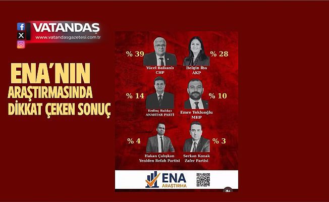 Anket sonuçları şu şekilde sıralandı: CHP – Yücel Balkanlı: yüzde 39 AK Parti – Belgin İba: yüzde 28, Anahtar Parti – Erdinç Balıkçı: yüzde 14, MHP – Emre Tokluoğlu: yüzde 10 Yeniden Refah Partisi – Hakan Çalışkan: yüzde 4 ve Zafer Partisi – Serkan Konak: yüzde 3.