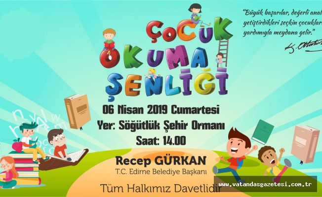 6 Nisan Cumartesi Saat:14.00’te Edirne Belediye Kent Ormanı’nda düzenlenecek olan şenlikte çocuklar hem doğanın keyfini çıkaracak; hem de aileleri ile birlikte kitap okuyacak. Edirne Belediye Başkanı Recep Gürkan’da Edirne Belediyesi tarafından düzenlenecek olan Çocuk Okuma Şenliği’nde çocuklara birbirinden değerli kitaplar hediye edecek.