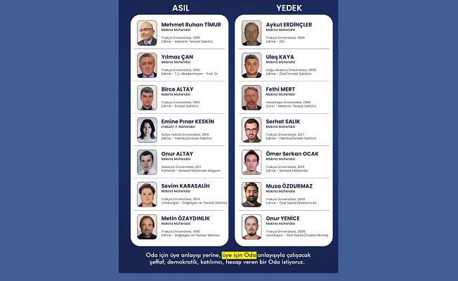 Makine Mühendisi Ruhan Timur, “TMMOB Makine Mühendisleri Odası Edirne Şubesi’nde Oda için üye anlayışı yerine; üye için Oda anlayışıyla çalışacak, şeffaf, demokratik, katılımcı, hesap veren bir Oda istiyoruz” dedi.