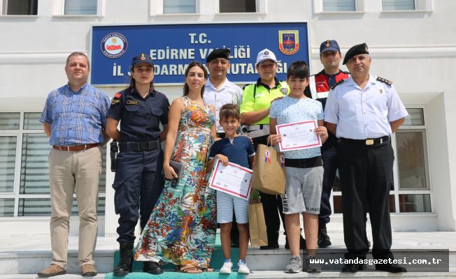 Edirne’den kampanyaya katılım sağlayan ortaöğretim öğrencileri Berk Batur Irmak ve Mehmet Çınar Küçükoğlu’na Jandarma Genel Komutanlığınca düzenlenen katılım belgeleri ve hediyeleri, 31 Temmuz 2019 günü Edirne İl J.K.lığında teslim edilerek, öğrenci ve velilerine Jandarmanın trafik konusundaki çalışmaları konusunda bilgiler verildi.