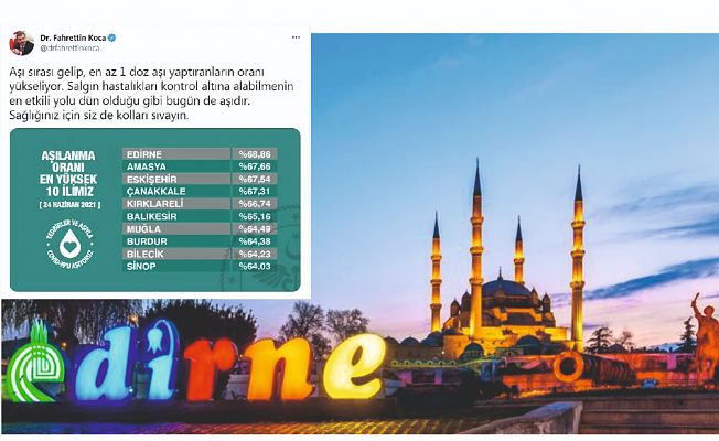 Bakan Koca, Twitter hesabından 24 Haziran itibarıyla aşılama oranı en yüksek 10 ilimizi paylaştı. Bakan Koca’nın yayınladığı tabloda 10 ilin aşılama oranlarında Edirne yüzde 68,86 ile birinci sırada yerini aldı. Aşılamada Türkiye birincilisi olan Edirne’de halkın aşıya olan duyarlılığını da görülmüş oldu.