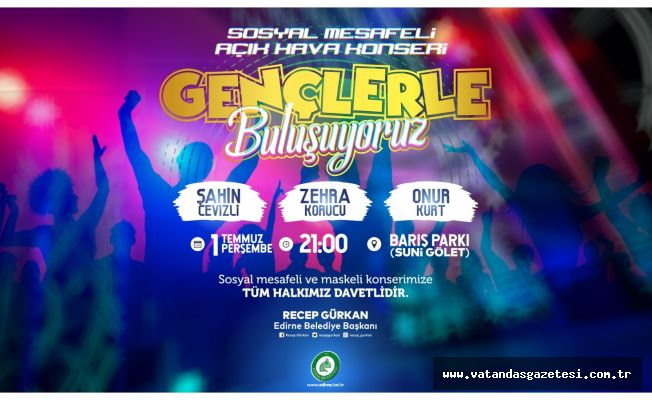 Gençlerin heyecanla beklediği konser, 1 Temmuz Perşembe Saat:21.00’da suni gölet olarak da bilinen Barış Parkı’nda düzenlenecek. Sosyal mesafe ve maske kuralarına uyularak yapılacak olan konserde Edirneli müzisyenler Zehra Korucu, Onur Kurt, Şahin Cevizli en güzel şarkılarını gençler için seslendirecek. Konser tüm Edirne halkının katılımına açık olacak.
