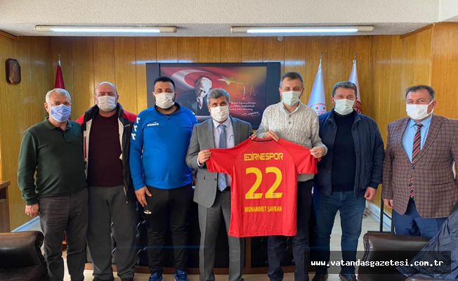 Edirne’de geçen yıllarda görev yapan Cumhuriyet Başsavcısı Muhammet Savran’ı adliye sarayında ziyaret eden Edirnespor yönetimi, isminin yazılı olduğu 22 numaralı Edirnespor formasını Cumhuriyet Başsavcısı Muhammet Savran’a hediye ettiler.