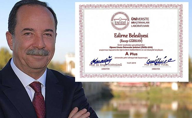 Sertifikada ise “Edirne Belediyesi Recep Gürkan, ÜNİAR tarafından gerçekleştirilen Öğrenci Dostu Üniversite Şehirleri (ÖDÜŞ-2019) araştırması kapmasında öğrencilerin beklentilerini en üst düzeyde karşılayan A Plus Üniversite Şehri olmaya hak kazanmıştır” ifadelerine yer verildi.