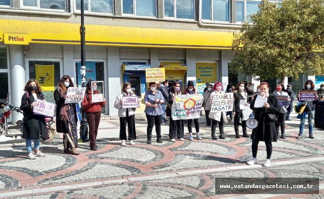 Nazlıcan Güzel de, “Kadına yönelik şiddet ve aile içi şiddetin önlenmesi ve bunlarla mücadeleye ilişkin Avrupa Konseyi Sözleşmesi’nin Türkiye Cumhuriyeti bakımından feshedilmesine 3718 Nolu Cumhurbaşkanlığı kararnamesi ile karar verilmiştir. Cumhurbaşkanlığı kararı ile İstanbul Sözleşmesinin fesih kararı gündeme geldiğinin hemen ertesinde bile bu ülkede 12 saatte 5 kadın öldürüldü. Fesih kararı geçersiz olduğu, İstanbul Sözleşmesi hala yürürlükte olduğu halde! Hükümet yetkilileri ve tek adam, sözlerinin toplum nezdindeki yıkıcı sonuçlarının farkında değildir. Kadınların yaşam hakkını ellerinden almak bir insanlık suçudur. Hem hukuki olarak adliyelerde hem bütün kadınlar hep birlikte meydanlarda bize ait olanı özgür ve eşit yaşama hakkımızı alacağız, İstanbul Sözleşmesi’ni uygulatacağız! Biz bu kararname geri çekilene kadar durmayacağız mücadelemiz büyüyecek. Bütün meydanlarda olacağız İstanbul Sözleşmesini Uygulatacağız. Fesih kararını geri çek! Yasayı uygula! ” şeklinde konuştu.