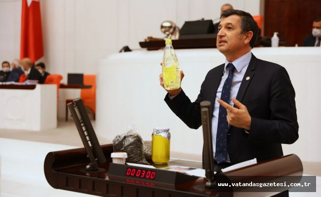 Konuşmasının devamında küspe, ham ve rafine ayçiçeği yağını gösteren CHP Edirne Milletvekili Doç. Dr. Okan Gaytancıoğlu“Niye bunları getirdim? Son günlerde zam şampiyonu. Bu yağ fiyatları neden artıyor? Böyle gösteriyorum ki kafanıza iyice girsin, Türkiye nasıl bir ülke, Türkiye nasıl üretici bir ülke ama sizin politikalarınız sayesinde nasıl ithalatçı bir ülke oluyor? Bakın, bu ayçiçeği. Bunun 1 tonu bundan beş ay önce 360 dolardı, şu anda 740 dolar yani 2 katından fazla arttı.