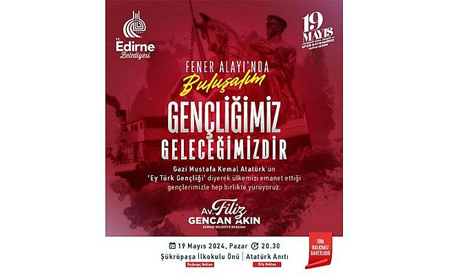 Edirne Belediye Başkanlığı tarafından 19 Mayıs Atatürk’ü Anma, Gençlik ve Spor Bayramı’nda “Gençliğimiz Geleceğimizdir” Fener Alayı ve 19 Mayıs Atatürk’ü Anma, Gençlik ve Spor Bayramı Konseri düzenlenecek.