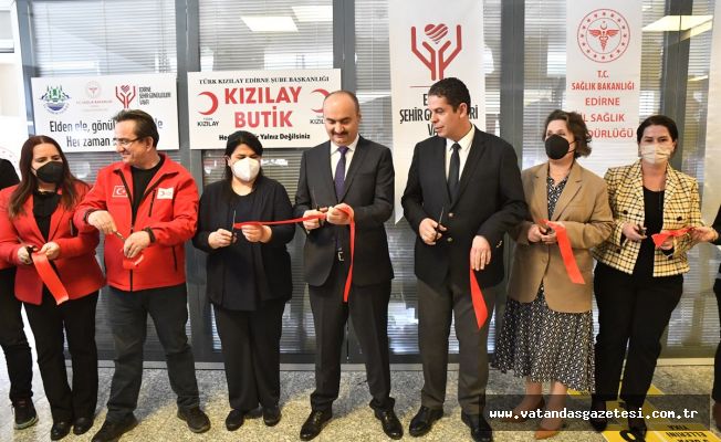 Sultan 1. Murad Devlet Hastanesinde açılan ve ihtiyaç sahibi hastalara tıbbi olarak verilen desteğin yanında sosyal olarak da hizmet verebilmek amacıyla kurulan ‘Kızılay Butik” in açılışına İl Sağlık Müdürü Uzm. Dr. İshak Yıldırım, Kızılay Edirne Şube Başkanı Kadir Çakay, Kızılay yöneticileri, sağlık çalışanları ve vakıf üyeleri de katıldı.