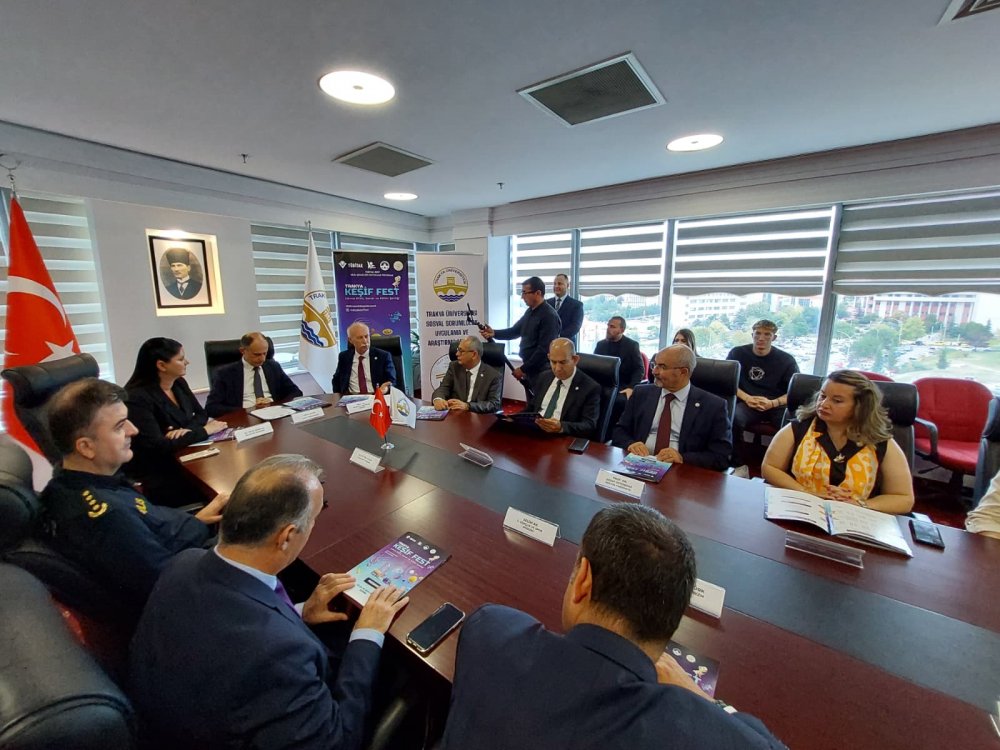 Trakya Üniversitesi Rektörlüğü Yönetim Kurulu Salonu’nda “Trakya Keşif Fest” projesinin imza töreni gerçekleştirildi. Törene Edirne Vali Yardımcısı Sıdkı Zehin, Edirne Belediye Başkanı Av. Filiz Gencan ve Trakya Üniversitesi Rektörü Prof. Dr. Mustafa Hatipler katıldı.