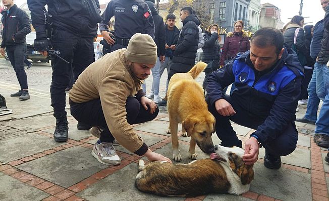 Ziraat Bankası Dört yol da caddeye bir anda atlayan köpeğe bir araç çarptı. Aniden yola çıkan köpek, aracın çarpmasıyla hafif şekilde yaralandı. Köpeğin acı dolu sesini duyan çevredeki zabıta ve polis gelerek köpeğe yardım etmek istediler. Köpeği zapt etmekte zorlanan zabıta ekipleri, hemen Belediye Barınağını arayarak ekip çağırdı. Bu sırada acı çeken köpeğin yanına gelen arkadaşı, köpeğin yaralı ayağını önce kokladı, ardından arkadaşının yüzünü yalamaya başladı. Yaralı köpeğin acısını paylaşmak isteyen diğer köpeğin bu davranışı çevrede toplanan vatandaşları hüzünlendirdi. Vatandaşlar bu arada yaralı köpeği severek sakinleştirmeye çalıştılar.