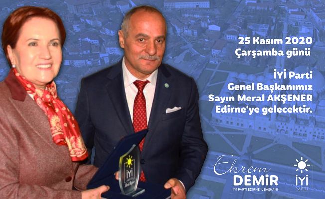 İYİ Parti Edirne İl Başkanı Ekrem Demir, İYİ Parti Genel Başkanı Meral Akşener'in 25 Kasım Edirne'nin düşman işgalinden kurtuluşunun yıldönümü dolayısıyla düzenlenecek törene katılacağını söyledi.