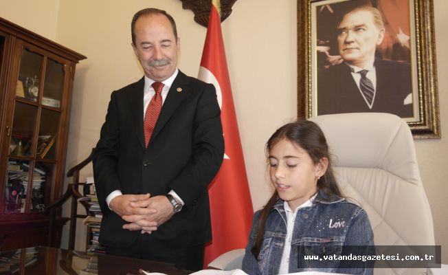 Bir günlüğüne Edirne Belediye Başkanlığı koltuğuna oturan İnönü İlkokulu Öğrencisi Seldanaz Tunca, “Öncelikle şunu belirtmek isterim ki; Ata’mızın bizlere armağan ettiği bu günde çocukları temsilen bu makama oturduğum için çok mutluyum ve gururluyum. Bana bu imkânı tanıyan herkese, özellikle öğretmenlerime çok teşekkür ederim. Bu makam, bugün bana aitse ve istediğimi yapabileceksem istediklerim şunlar; önceliğimiz okullarımız olacaktır. Okullarımıza belediyemizin imkânlarıyla yapılabilecek her türlü desteği sağlayacağım. Edirne’de sadece çocuklara ait bir festival düzenleyeceğim. Bu festivali her yıl yapacağım. Ben buraya gelirken arkadaşlarımın fikirlerini aldım. Onlar en çok oyun alanlarının azlığından ve yeşil alanların kirliliğinden bahsettiler. Bende onlara bu konu üzerinde çalışacağıma söz verdim. Ayrıca belediyemize ait, her çeşit meyve ağacının olduğu bir bahçe oluşturacağım. Edirne’mizin çocukları bu bahçeden istedikleri gibi dalından meyveleri koparıp yiyebilecekler ve bu bahçeden ücretsiz faydalanabilecekler. Ben bir günlük başkanım ve bir günlük bu kadar çalışmanın yeterli olduğunu düşünüyorum. Edirne’mizin kalkınması mutlu huzurlu bir hayat sürebilmeleri için elimden geleni yapacağıma söz veriyorum.” şeklinde konuştu.