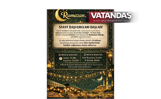 Ramazan Sokağı’nda stant açmak isteyen esnaf ve sanatkârlar için başvurular 9 Şubat 2026 tarihine kadar yapılabilecek. Başvurular, Edirne İli Çevre Koruma Vakfı Ticari İşletmesi aracılığıyla alınacak. Detaylı bilgi ve başvuru işlemleri için İdari İşler Personeli Ali Can Korkmaz ile iletişime geçilebilecek.