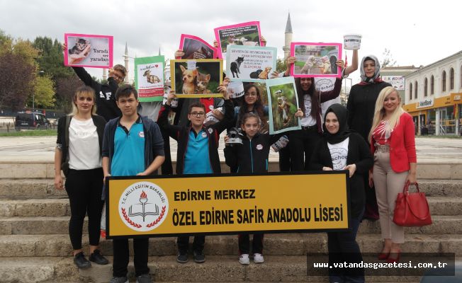 Edirne Safir Koleji tarafından 4 Ekim Hayvanları Koruma Günü nedeniyle anlamlı bir etkinlik düzenlendi. Okulun Müdür Yardımcısı Meltem Erdoğan ve Okul Öğretmenlerinden Leyla Ustabaşı’nın da katıldığı etkinlikte; öğrenciler, sokak hayvanlarının yaşadığı olumsuz şartlara dikkat çekebilmek adına vatandaşlara kedi ve köpek maması dağıttı.