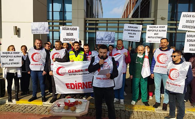Edirne 1. Murat Devlet Hastanesi önünde toplanan Genel Sağlık İş Sendikası üyeleri, adına basın açıklamasını Genel Sağlık-İş Edirne Şube Başkanı Özcan Arslan yaptı. Arslan, Sağlık Emekçilerinin, iktidarın şamaroğlanı olmadığını ve olmayacağını ifade ederek, “Kaşıkla verip kepçeyle almayı ekonomi politikası olarak kabul ettirmeye çalışan siyasi iktidar, ekonomideki beceriksizliğinin, başarısızlığının ve liyakatsizliğinin bedelini yine halkın her kesimiyle beraber sağlık emekçilerine ödetmeye çalışmaktadır” dedi.
