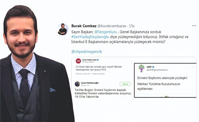 AKP Edirne İl Gençlik Kolları Başkanı Burak Cambaz, Cumhuriyet Halk Partisi (CHP) İstanbul İl Başkanı Canan Kaftancıoğlu’nun önceki yıllarda, sözde Ermeni Soykırımı ile ilgili paylaşımlarını hatırlatarak, sosyal medya hesabı üzerinden eleştirilerde bulundu. CHP Edirne İl Gençlik Kolları İl Başkanı Sergen Kuru’da, Cambaz’ın bu paylaşımlarına bir cevap vererek şunları söyledi; “Sevgili mevkidaş Burak Cambaz, Millet İttifakı, CHP,İYİ Parti,Demokrat Parti,Saadet Partisinden oluşmaktadır. İstanbul İl Başkanımızın tweeti, İl Başkanı olmadan önce atılmış bir tweet olup partimizin Sözde Ermeni Soykırımı Politikası bellidir. Daha önce ki hükümetler döneminde de sözde diaspora Türkiye’ye karşı bu konuyu tehdit olarak kullanmış ama sizin hükümetiniz döneminde, bunu tanıyıp dile getirebilme cesareti gösterilmiştir. Bu da Türkiye’yi yönetenlerin zaafiyetini göstermektedir. Sorularını içtenlikle cevapladığımı düşünerek bende vatandaşlarımızın sizlere sormak istediğini bu vesile ile iletmek isterim; 17 Günlük tam kapanmada: aş yok, iş yok, aşı yok, 128 milyar dolar yok, millete acil destek paketi yok, ABD’ye doğru dürüst bir kınama, yaptırım yok, ortada ciddi bir hükümet yok, yok da yok. Peki siz bunlarla ne zaman yüzleşeceksiniz?”