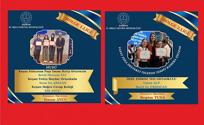 Edirne İl Milli Eğitim Müdürlüğü tarafından yapılan açıklamada" TÜBİTAK 2024 Yılı Ortaokul Öğrencileri İstanbul Avrupa Yakası Bölge Finaline katılan öğrencilerimiz aldıkları 4 Birincilik 1 İkincilik dereceleri ile yarışmaya damga vurdu. Öğrencilerimizi ve kendilerini yetiştiren değerli öğretmenlerini tebrik eder, başarılarının artarak devamını dileriz" denildi.