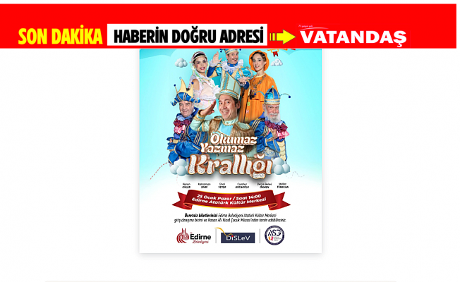 Edirne Belediyesi, çocukların kültürel gelişimine katkı sunmak amacıyla anlamlı bir etkinliğe daha imza atıyor. Cumhur Kocaoğlu’nun yazıp yönettiği, Ünal Yeter ve Kahraman Sivri gibi usta isimlerin rol aldığı "Okumaz Yazmaz Krallığı" adlı çocuk oyunu, 25 Ocak Pazar günü saat 14.00'te Atatürk Kültür Merkezi’nde izleyiciyle buluşacak.