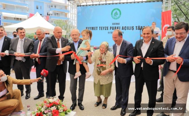 Böyle bir parkın inşaat alanı olmaması için mücadele veren Kıymet Teyze’ye yürekten teşekkür ettiğini belirten CHP Genel Başkanı Kemal Kılıçdaroğlu, “Belediye Başkanımız dedi ki, ‘Belediye başkanıyız geliriz, gideriz ama hiçbir çocuğun yatağa aç girmesini istemeyiz’ Belediye Başkanlarımız ebetteki çocuklarımızın yatağa aç girmesini istemeyeceklerdir. Ellerinden gelen bütün çabayı göstereceklerdir. Ama belediye başkanlarımız çok iyi biliyorlar ki bir kentin yeşilliğe, ağaca, kuşlara ihtiyacı var. Dolayısıyla o parklarda oturacak, torunları ile birlikte gezecek, hayatı bir anlamda özümleyecek alanlara da ihtiyacı var. Zaten kent dediğiniz aynı zamanda park demektir, yeşillik demektir. Kent içinde yaratılan ormanlar demektir. Edirne’ye bakıldığında da olağanüstü bir coğrafyası ve görkemli bir tarihi var. Bu tarihi korumamız gerekiyor. Kıymet teyzenin adının da buraya verilmesi çok daha önemli. Yeşilliği isteyen ve bunun mücadelesini veren bir kişinin isminin yaşatılması çok daha değerlidir. Bu bundan sonraki mücadelelere de büyük destek verecektir. Biz ağacımızı korumak istiyoruz. Kuşu korumak istiyoruz. Sokaklarda gezen bizim dışımızdaki canlıları korumak istiyoruz. Biz hep beraber bir arada yaşamak istiyoruz. Torunlarımızla, yaşlılarımızla beraber bir arada huzur içinde yaşamak istiyoruz. Ben Bu parkı Edirne’ye kazandıran ve daha önemlisi, bu mücadelenin koç başlığını yapan ve Kıymet teyzemin adını da bu parka veren Belediye Başkanıma yürekten teşekkür ediyorum” diye konuştu.