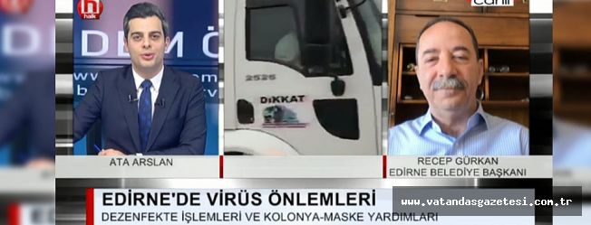 Edirne Belediye Başkanı Recep Gürkan, Halk TV’de canlı olarak yayınlanan Gündem Özel Programı’nın konuğu oldu. Yayına bağlanan Edirne Belediye Başkanı Recep Gürkan, en kutsal hakkın yaşam hakkı olduğunu söyledi. Bu nedenle ayrımsız yaşam hakkını savunmanın en önemli ve en birincil görev olduğunu vurgulayan Belediye Başkanı Recep Gürkan, “Bu noktada Edirne Belediyesi olarak, virüs krizinin hemen öncesinde bir mülteci krizi yaşadık. Edirne son günlerde çok hareketli bir şehir oldu. Yaklaşık 200 binden fazla düzensiz göçmen Edirne sınırlarına geldiler, Yunanistan’a geçmek istediler, AB’ye geçmek istediler. 28 Şubat’ta başlayan bu süreç aslında bizim kriz anlamında bir fırsatımız oldu. Daha dinamik hazırlanmamıza yol açtı. 28 Şubat’ta başlayan mülteci krizi süreci ile beraber, koronavirüsü krizinin de yaklaşmakta olduğunu gördük. Mültecilerin de Edirne’de çok yoğun olması nedeniyle, Türkiye’de vaka görülmeden önce 8 Mart’tan itibaren dezenfeksiyon çalışmalarına başladık. Bir anlamda öncelikli adım atan belediyelerden birisi olduk. Sağlık Bakanlığı 10 Mart’ta kriz açıklamasını yaptı ve biz bu süreci daha da yoğunlaştırarak, daha da hızlandırarak, çalışmalara devam ettik” diye konuştu.