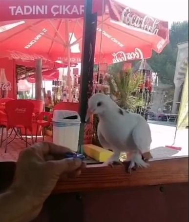 Edirne’nin Yeniimaret Semti’nde termometrelerin 40 derecenin üzerinde bir sıcaklığı gösterdiği saatlerde çay bahçesinde istirahat eden Faruk Darufırfır’ın yanına yorgun halde kelebek cinsi güvencin kondu. Gagası açık haldeki güvercine elindeki pet şişenin kapağıyla su veren Darufırfır, bunu birkaç kez tekrarladı.