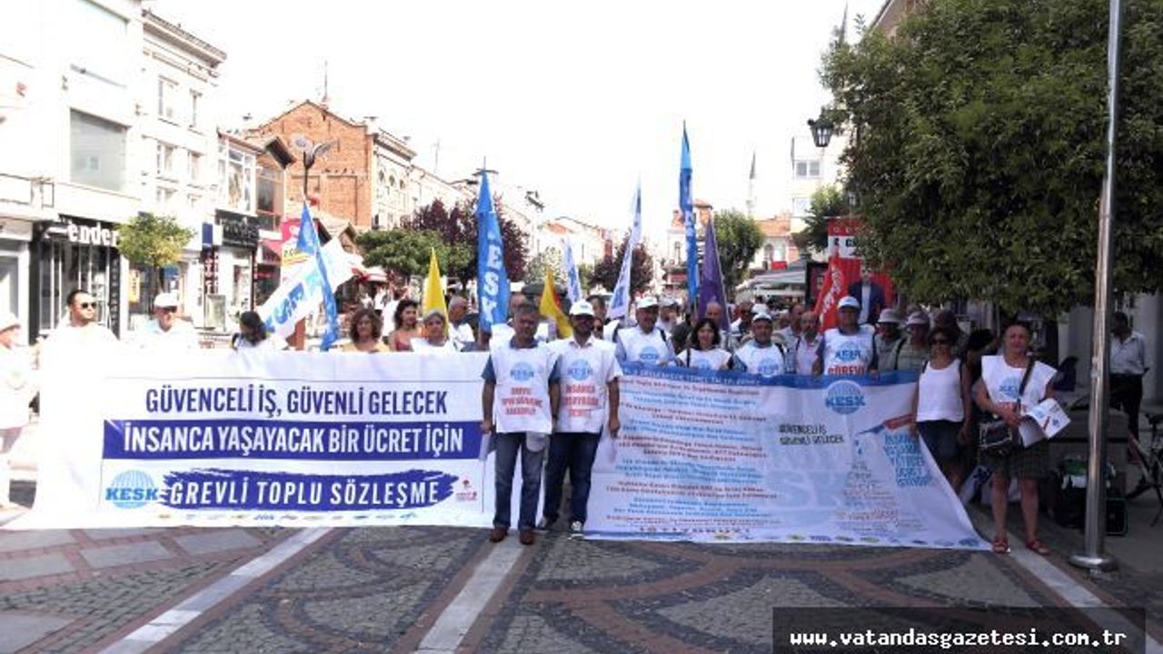 Kamu Emekçileri Sendikaları Konfederasyonu 1 Ağustos’ta başlayacak toplu sözleşme görüşmeleri için Ankara’ya yürüyor. KESK Edirne Şubeler Platformu dün Saraçlar Caddesi’nde konuyla ilgili basın açıklaması düzenledi. Düzenlenen basın açıklamasına, KESK Eğitim, Örgütlenme ve Basın Yayın Sekreteri İlhan Yiğit, KESK Edirne Şubeler Platformu Dönem Sözcüsü Ayhan Fırtına, Yapı Yol Sen Genel Başkanı Nihat Bayram, Eğitim Sen Mali Sekreteri Ahmet Karagöz, SES Genel Sekreteri Pınar İçel ve konfederasyon üyeleri katılım gösterdi.