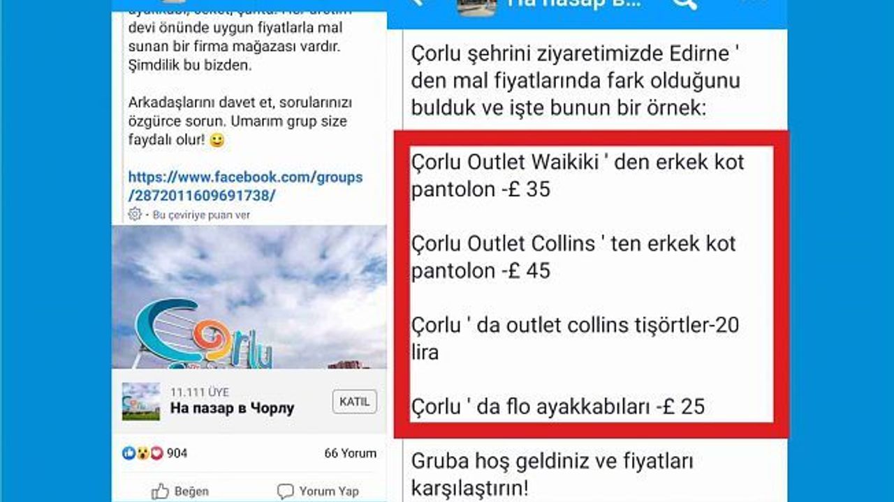 ‘Çorlu’da Alışveriş’ grubunun açıklama kısmında şu ifadeler kullanıldı: “Merhaba arkadaşlar. Çorlu’ya büyük ilgi nedeniyle ‘Çorlu’da Alışveriş’ grubunu oluşturduk. Grupta birçok ünlü mağazanın yerini bulabilirsiniz. Çorlu’yu ziyaretimizde Edirne’deki ürün fiyatlarında fark olduğunu bulduk. İşte bunun için birkaç örnek; Çorlu Outlet Waikiki’de erkek kot 35 TL, Çorlu Outlet Colins’te erkek kot pantolon 45 TL, Çorlu Outlet Colins t-shirtler 20 TL ve Çorlu Flo’da ayakkabılar 25 TL daha ucuz.”