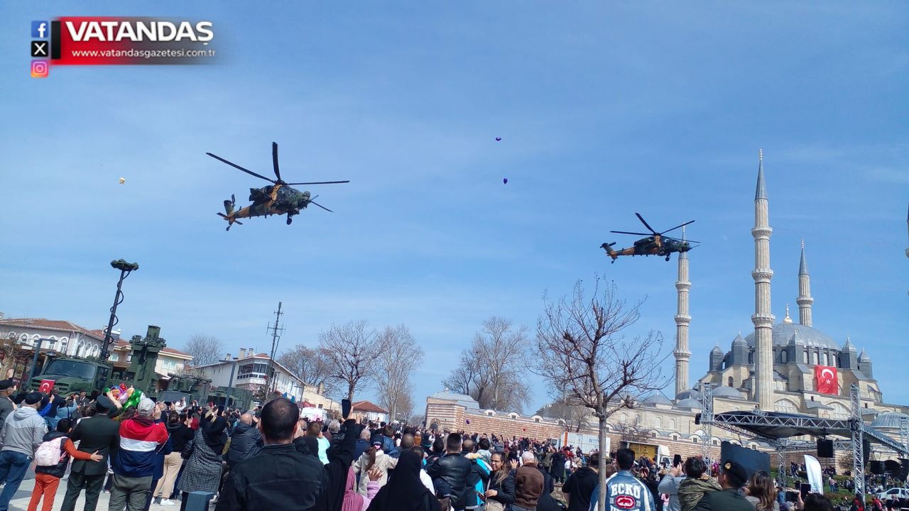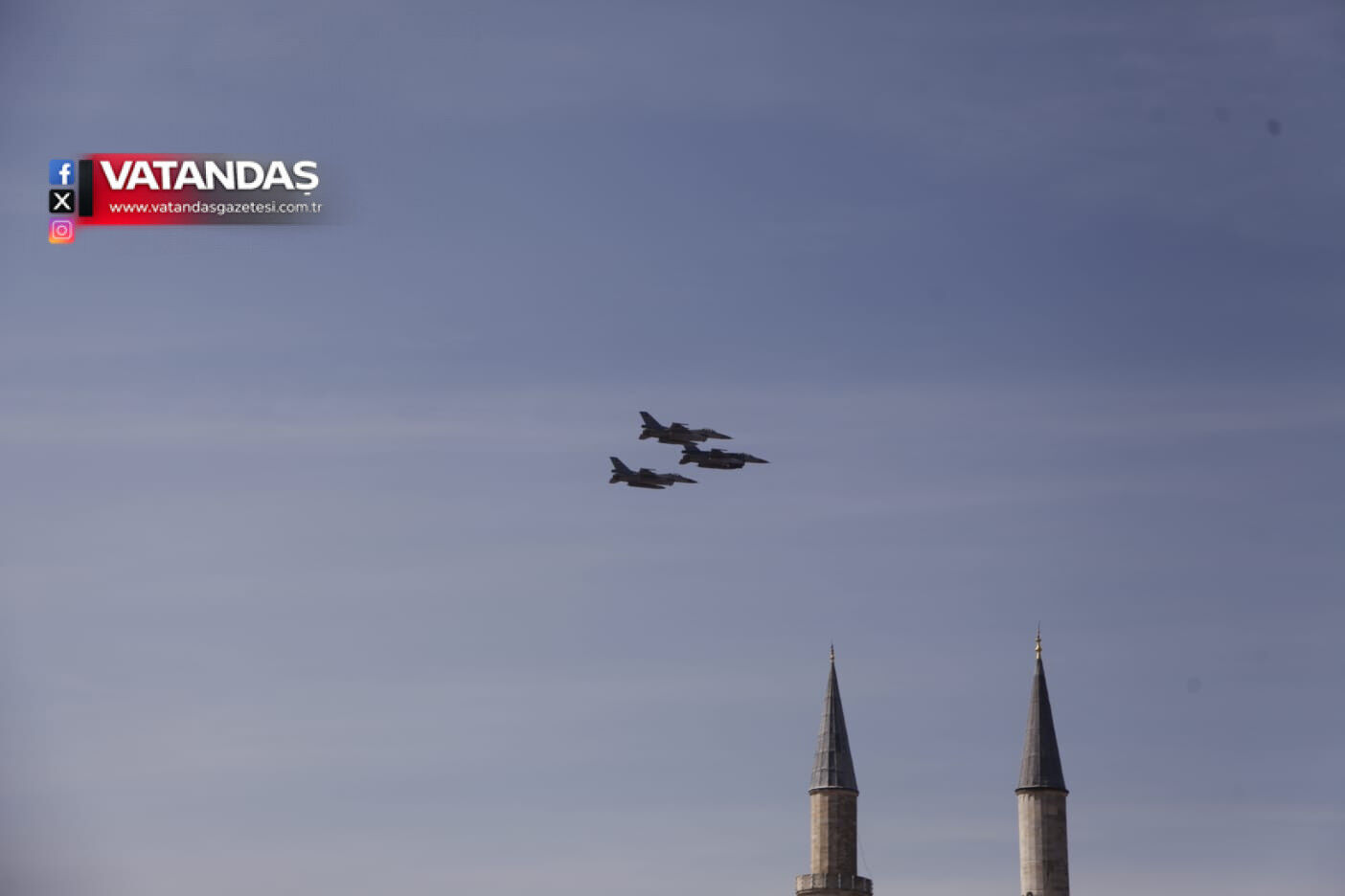 Programın en dikkat çeken anlarından biri ise gökyüzünde yaşandı. Türk Hava Kuvvetleri’ne ait F-16 savaş uçakları, Selimiye Camii semalarında gerçekleştirdiği alçak uçuşla meydanı dolduran binlerce kişiye unutulmaz anlar yaşattı. Jetlerin gökyüzünde bıraktığı izler ve yankılanan motor sesleri, törenin coşkusunu zirveye taşıdı. Vatandaşlar bu anları cep telefonlarıyla kaydederken, alkış ve tezahüratlarla destek verdi.
