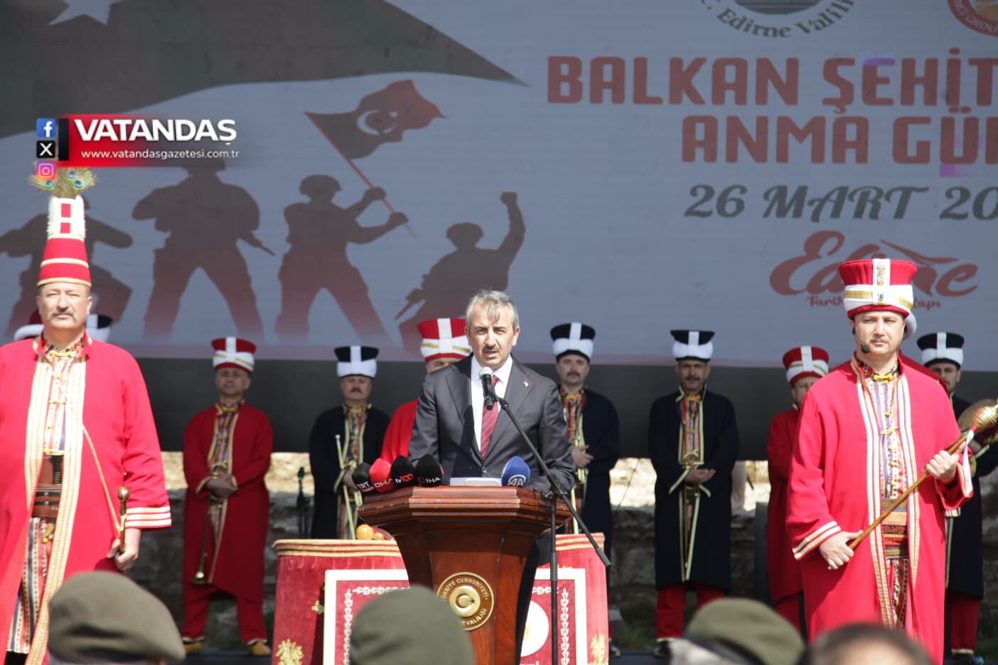 Selimiye Meydanı’nda düzenlenen törende konuşan Vali Yunus Sezer, Balkan Savaşları’nın Türk milletinin en ağır imtihanlarından biri olduğunu vurguladı. 113 yıl önce Edirne’de yaşanan yokluk, açlık ve kuşatma şartlarına rağmen gösterilen direnişin, milletin karakterini ortaya koyduğunu ifade eden Sezer, “Vatan, imkânsızlıklar içinde bile terk edilmeyecek kadar kutsaldır” dedi.