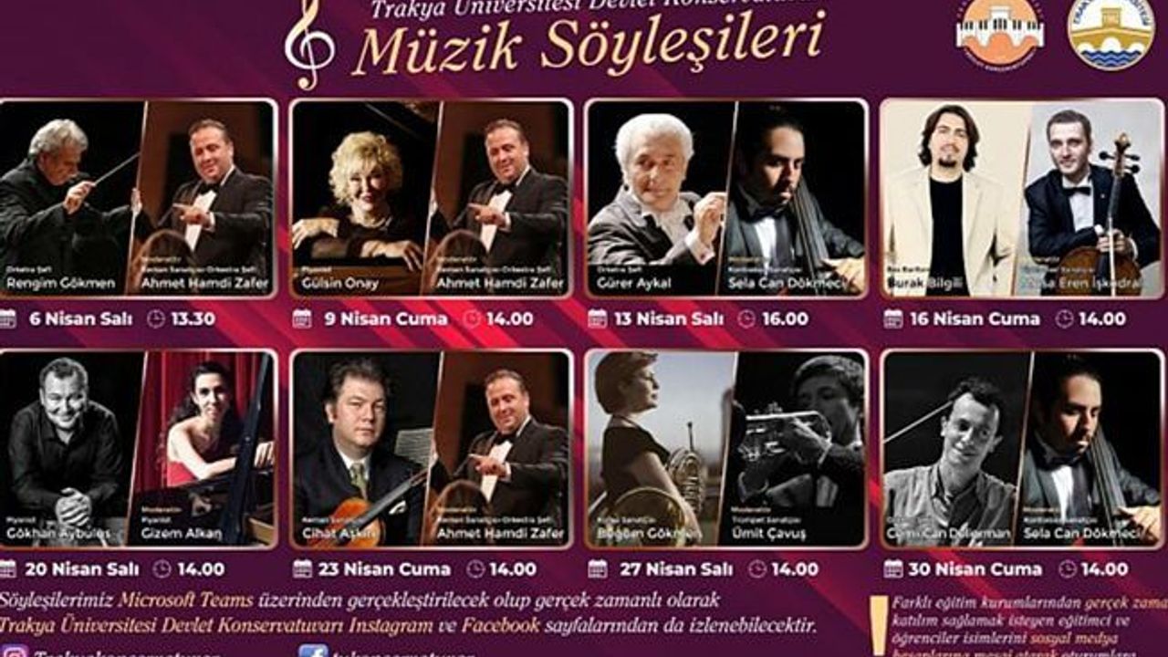 Son olarak Trakya Üniversitesi Rektör Yardımcısı ve Konservatuvar Müdürü Prof. Ahmet Hamdi Zafer ve Konservatuvar Müdür Yardımcısı Dr. Öğr. Üyesi Sela Can Dökmeci koordinatörlüğünde 06-30 Nisan 2021 tarihleri arasında gerçekleşen “Müzik Söyleşileri” kapsamında sanat camiasının önemli duayenleri ile genç sanatçı adaylarına bilgi ve tavsiyelerde bulunulması adına çevrimiçi canlı oturumlar düzenlendi. Orkestra Şefi Rengim Gökmen, Piyano Sanatçısı Gülsin Onay, Keman Sanatçısı Cihat Aşkın, Bas Bariton Sanatçısı Burak Bilgili, Korno Sanatçısı Begüm Gökmen ve Orkestra Şefi Cem’i Can Deliorman gibi dünyaca tanınmış sanatçılar ile yapılan bu zengin söyleşiler öğretim üyeleri moderatörlüğünde Mayıs ve Haziran aylarında da tanınmış pek çok sanatçının konuk olacağı oturumlarla devam edecek.