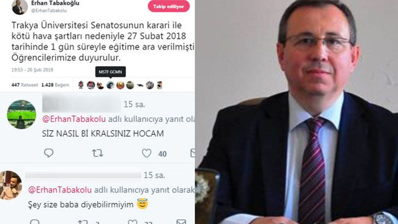 Trakya Üniversitesi Rektörü Prof. Dr. Erhan Tabakoğlu, akademik eğitime bir gün ara verildiğini sosyal medya hesabından "Trakya Üniversitesi Senatosunun karari ile kötü hava şartları nedeniyle 27 Subat 2018 tarihinde 1 gün süreyle eğitime ara verilmiştir. Öğrencilerimize duyurulur." şeklinde duyurmuştu. Rektör Tabakoğlu’nun paylaşımı kısa sürede yoğun paylaşım ve yorum aldı. Öğrencilerce Tabakoğlu’nun paylaşımına "Siz nasıl bir kralsınız", "parti kurun oy verelim", "T.Ü. evimiz, Erhan Babamız "Heykeli dikilse yüreğine beton yetmez", "Hocam nefesimizi kesiyorsunuz" gibi yorumlar yapıldı.